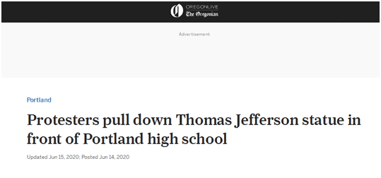 【环球网报道 记者 张晓雅】反种族歧视怒火还在美国多地延烧,美国《俄勒冈人报》报道,抗议者14日晚在俄勒冈州波特兰市东北部的杰斐逊高中,推倒了美国第三任总统托马斯 杰斐逊的雕像。