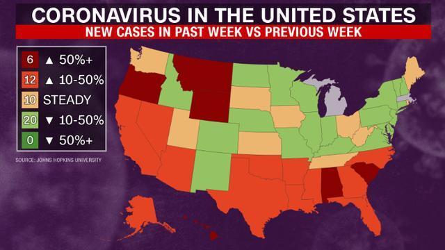 即使卫生专家对最近德克萨斯州、佛罗里达州、亚利桑那州、阿拉巴马州、俄克拉荷马州和阿肯色州等州新冠病毒新增病例数量暴涨连连发出警告,彭斯仍表示,该国一直在稳步前进,病毒正在离美国越来越远。