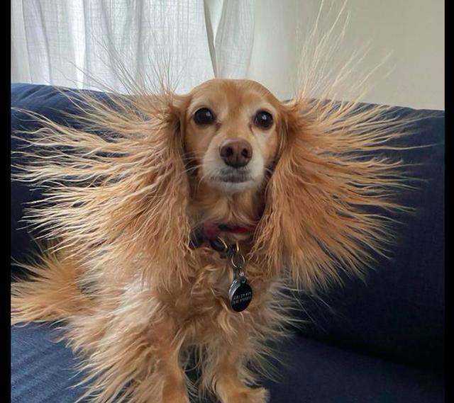 怎么感觉有点像是狮子王呢!而狗狗也是一脸的懵圈,完全不知道发生了什么事情,是不是觉得很神奇,毛发为什么都自己竖起来不受控制了呢!狗狗:铲屎的,我这是要起飞了吗?我不敢动啊!快来救救我,我感觉要飘起来了!