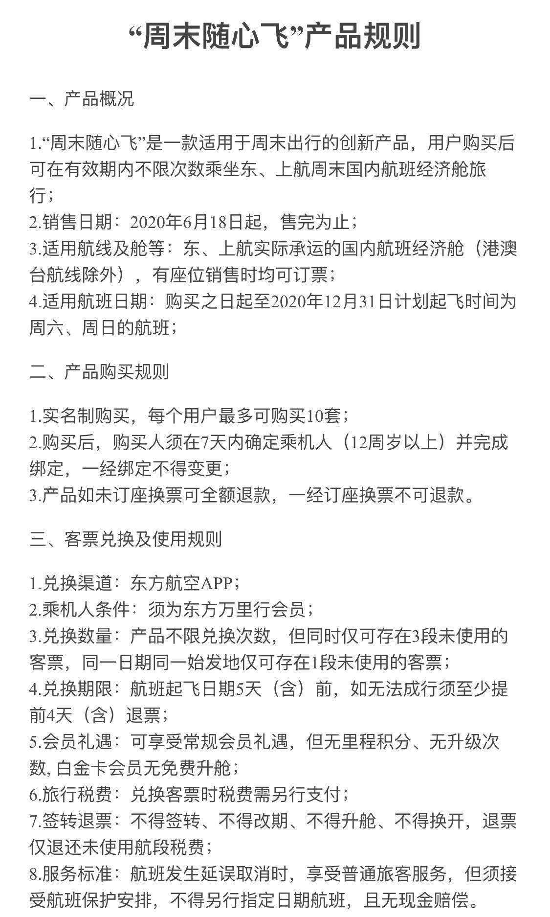 按照东航的说法,抢到这款产品的旅客可在2020年内的任意周六和周日,不限次数乘坐东航和上航航班,畅飞国内全航线(港澳台航线除外)。
