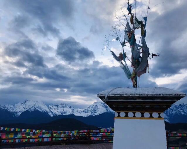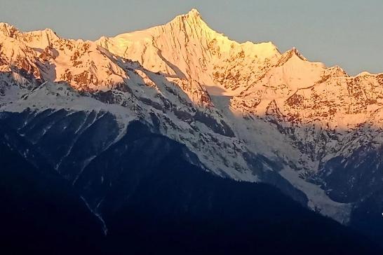 如果你一次就能看到日照金山那真的是足够幸运,梅里雪山山顶长年云雾缭绕、仙气飘飘,所以很多朋友和毛线交流说自己来了8次都没有见到。想要一睹雪山日月同辉奇观的朋友可以买一张飞来寺的门票,去到观景台欣赏梅里雪山的盛世美颜。当黎明前的雾气逐渐消散,日出东方,清晨的第一缕阳关映射在卡瓦格博峰的峰顶,余晖渐渐散落在山腰,那样美轮美奂的日照金顶之景就那样毫无保留的展现在人们眼前,言语的苍白几乎无法准确的描述所见的景象,真的向电视剧中写的那样仿佛是“日月同辉,天门大开”。