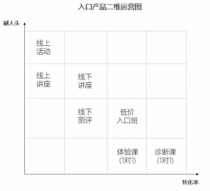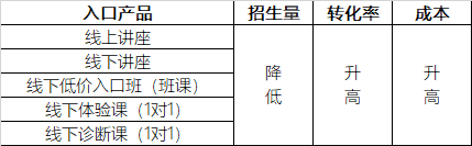 入口产品与正价课的价格差距要尽量小,产品定价直接影响转化率。比如由班课转1对1很难,但是由1对1转班课就较为容易,主要是因为价格差异。