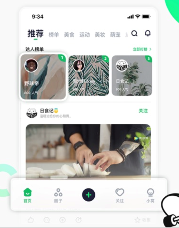 首页又分为推荐、榜单、美食、运动、时尚、萌宠、旅游、HOME八大模块,后六大模块都有相关主体的内容。不难推测,推荐类目中根据算法来给用户推送个人偏好的内容。