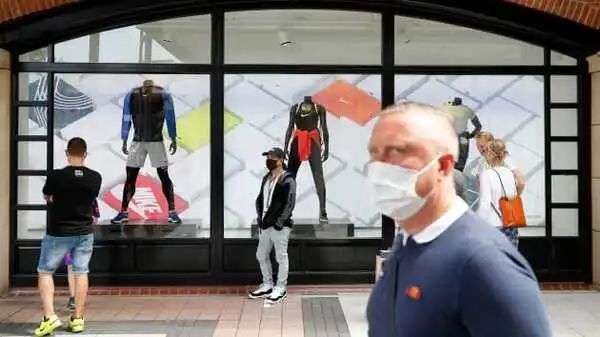 ▲6月16日,英格兰朴茨茅斯一家购物中心新开业的耐克门店,购物者正在排队进店