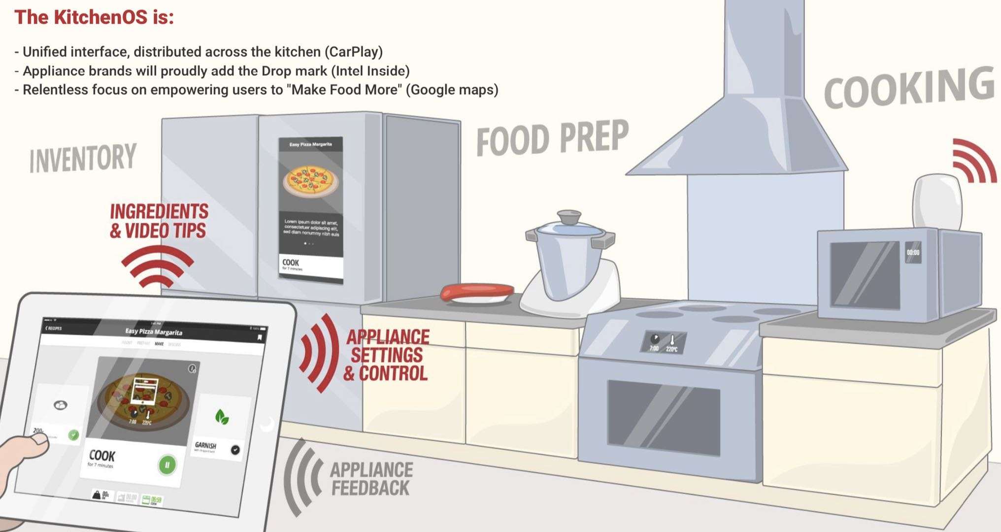 「Drop」成立于爱尔兰都柏林,在美国旧金山设有办公室。公司最早研发了智能厨房秤,用于精准测量食材用量,通过配套App来智能控制。公司CEO Ben Harris介绍,「Drop」希望构建一个可以协调所有智能厨房电器的应用程序,并提供IOT全栈物联网平台。因此,公司后续由自主开发硬件转型为开发兼容不同厨房家具硬件的操作系统(OS),目前已经跟博世、凯伍德、美国通用家电、伊莱克斯在内的众多家电生产商合作,帮助其厨具产品实现IOT连接。