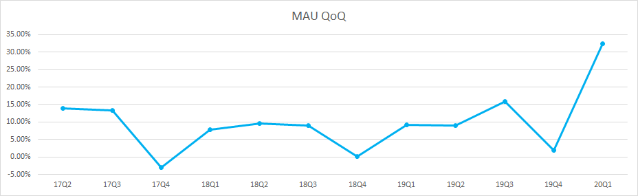 从QoQ(季度环比)MAU的增幅数据看,B站一直受其用户主要为学生的特性影响,MAU增幅呈现非常明显的周期性变化趋势。往年的Q3(暑假档)一直是B站增长与促活发力的最佳时间。今年因受疫情影响,B站的增长峰值时间很可能前移到了Q1-Q2。所以B站是否能突破增长的泛化压力位,最好的观察时间点发生在今年Q3-Q4,看看后疫情时期B站的MAU增速水平是否能保持在去年的增速上。