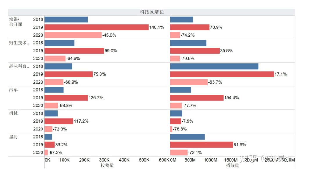 科技区的数据增长也很明显,20年Q1,科技区的投稿YoY增幅102%,播放量的YoY增幅达到了106%,而从科技区内的分类来看,2019年演讲公开课的投稿量增幅最大。而原本播放存量最大的趣味科普增幅17%,虽然看增速不大,但是播放总数依旧遥遥领先。