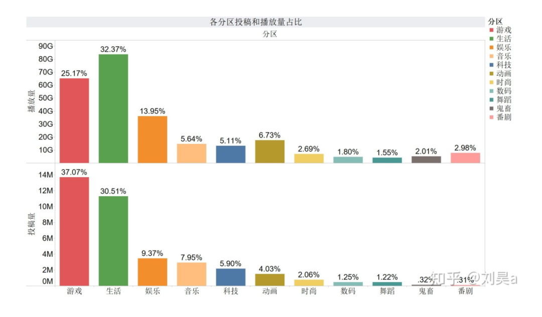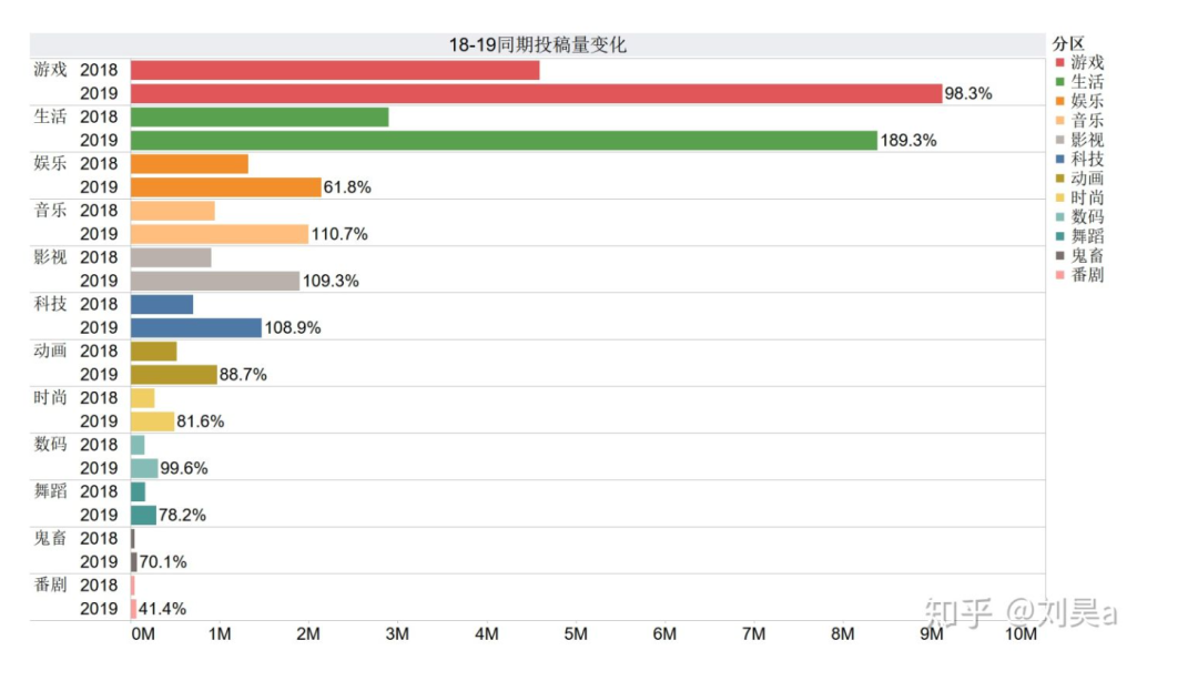 从爬虫数据来看,生活区在2019年的投稿量增幅极大,其后是音乐、影视、科技三个区。从播放量看,生活区的播放量也占到了B站最大的份额。