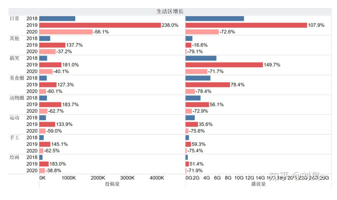 而单独拆开生活区内的数据来看,2019年播放量增幅最大的依次是搞笑和日常两个分类。