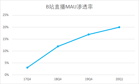 直播业务的快速增长的关键因素来自直播业务B站用户的渗透率提升。B站直播业务MAU渗透率当前已经超过20%,按照B站20年Q1的1.7亿MAU数据,整体直播MAU覆盖已经达到了3500万左右。直播的单月流水在2019年底已经能够超过1.5亿RMB,疫情期间大概率超过了2亿RMB。