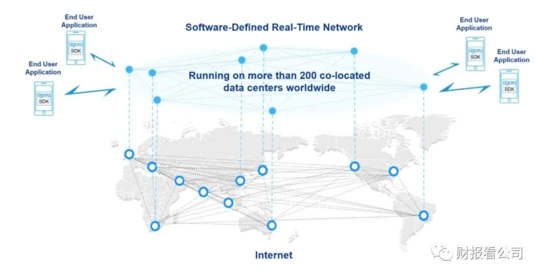 技术层面,声网Agora建立了SD-RTN,这是一个覆盖在公共网络上的实时互动虚拟网络,在全球200多个协同定位数据中心运行,处理使用Agora SDK终端用户设备之间的实时数据传输。