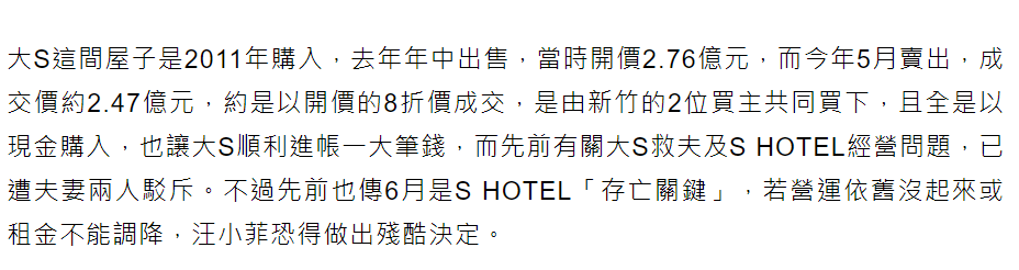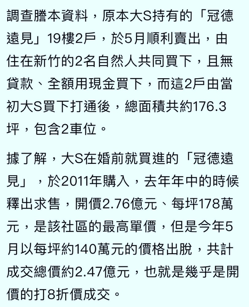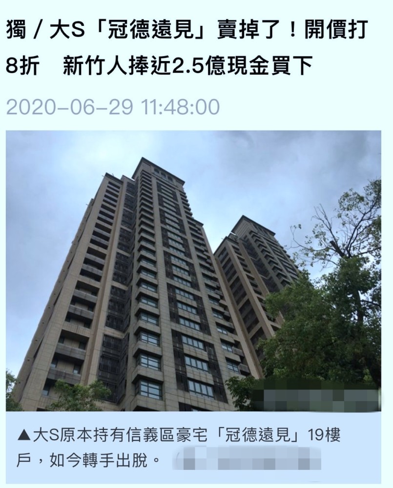 台媒指出,大S的房子由新竹两位买主共同买下,且全是以现金购入,让大S顺利进账一大笔钱。