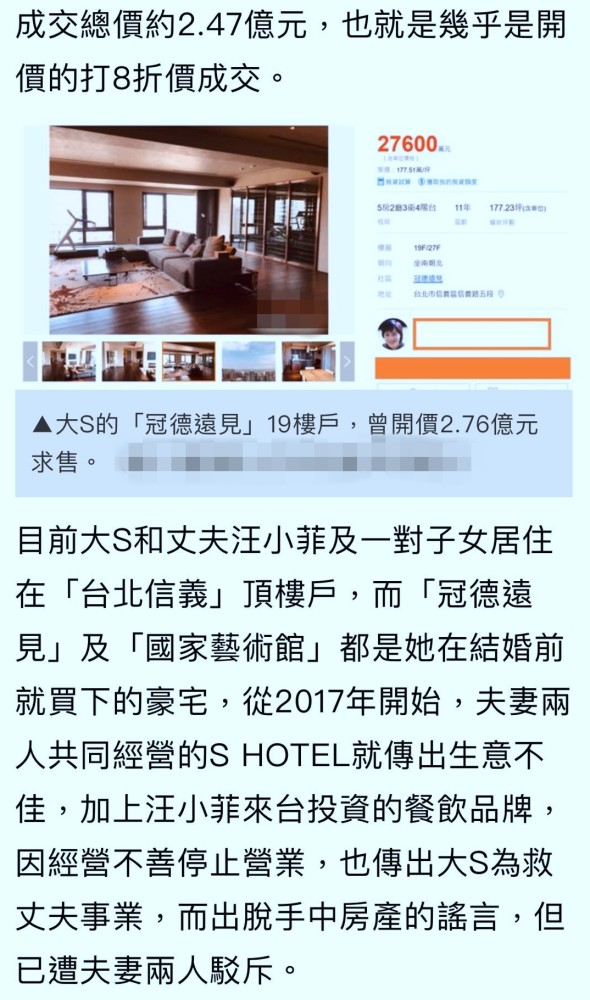 去年,有报道指汪小菲的酒店生意一落千丈,甚至遭遇经济危机,所以要大S出手搭救丈夫,其中一招就是卖出名下的“冠德远见”19楼2户,套现解决资金困难。