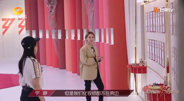 《浪姐》开头的集体出场,宁静是有点“端着”的。在签到的环节,每个人能都要自己选个口红印上一吻,宁静却说“但是我们化妆师不在旁边”。