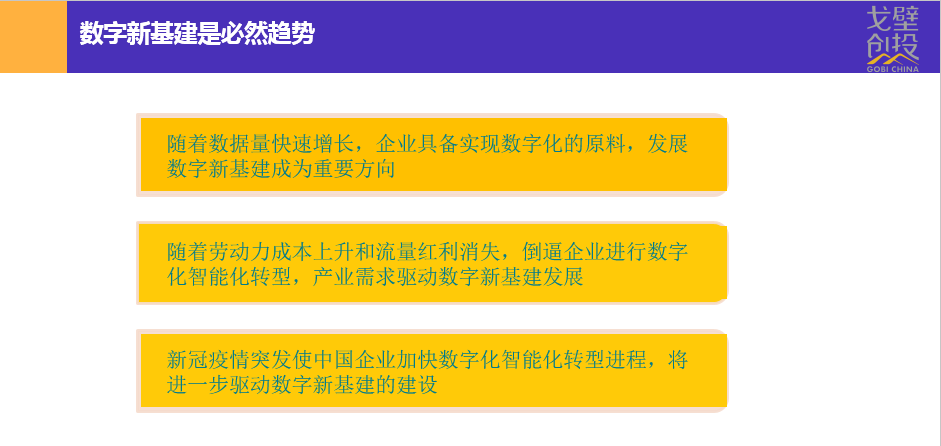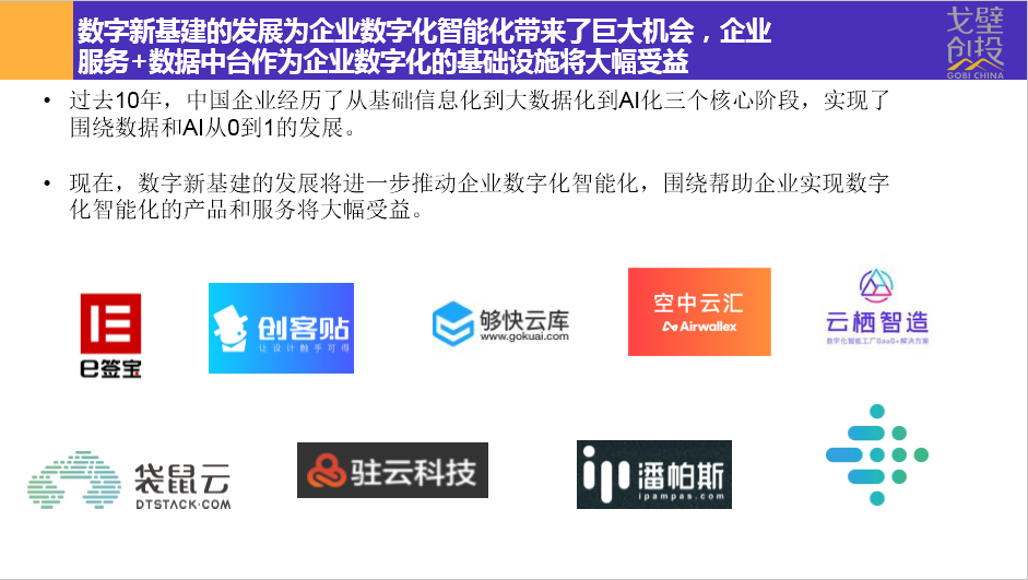 数字新基建的发展为企业数字化、智能化带来了巨大的机会,所以企业服务加数据中台作为企业数字化的基础设施将大幅受益。为什么会这样区别呢?其实在戈壁创投角度来讲,我们看到了一个数字新基建发展的机遇,包括很多企业的数字化和信息化带来的挑战或者巨大机会,其实中间核心的两块在我们看来一个是企业服务,一个是数据中台。
