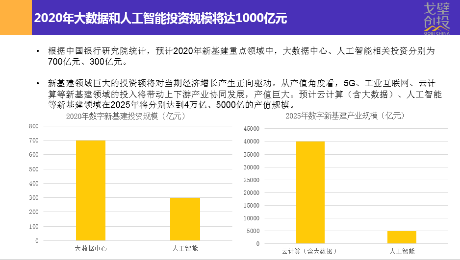 人工智能和大数据是新基建的重要组成部分,今年国家也特别提倡新基建的概念。新基建是立足于高新科技的基础设施建设,目前最受关注的主要包括七大领域,其中包括5G基站建设、特高压、城际高速铁路、城市轨道交通、新能源汽车充电桩、大数据中心、人工智能和工业互联网这几大领域。从戈壁角度来讲,因为我们是专注于早期投资的TMT的基金,主要涵盖的范围包括大数据中心和人工智能这两大领域,也是我今天分享的主题。
