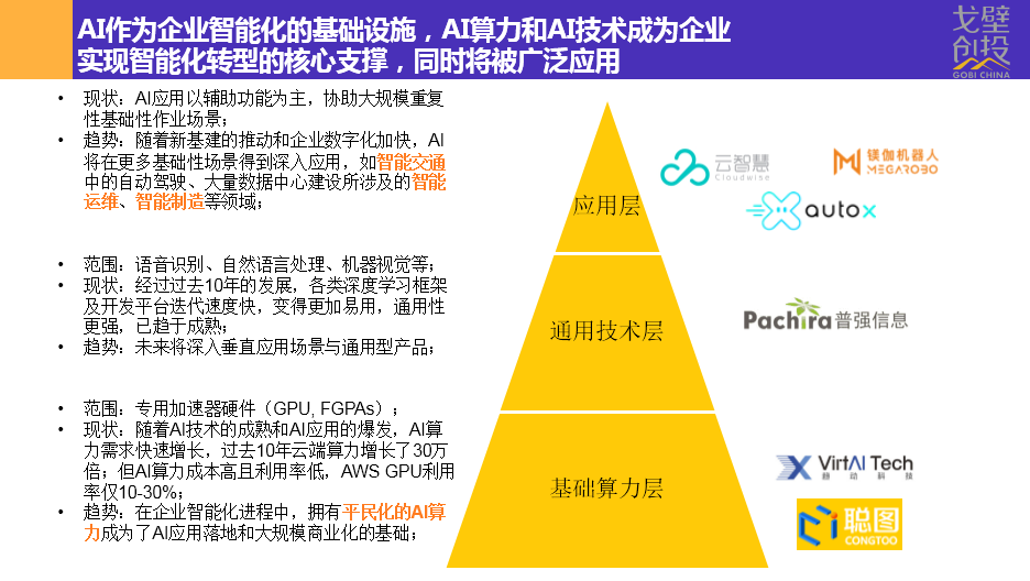 另外,人工智能领域的思考和布置,整体来看AI作为一个企业智能化的基础设施,AI的算力和AI技术成为企业实现智能化转型的核心支撑,同时将被广泛应用,这也是我们戈壁的看法。