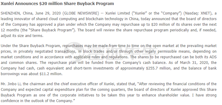 回购的股份为ADS或是普通股。此次回购计划的资金将来自公司的现金余额。截至2020年3月31日,迅雷拥有现金、现金等价物和短期投资约为2.557亿美元,银行借款余额约为1120万美元。