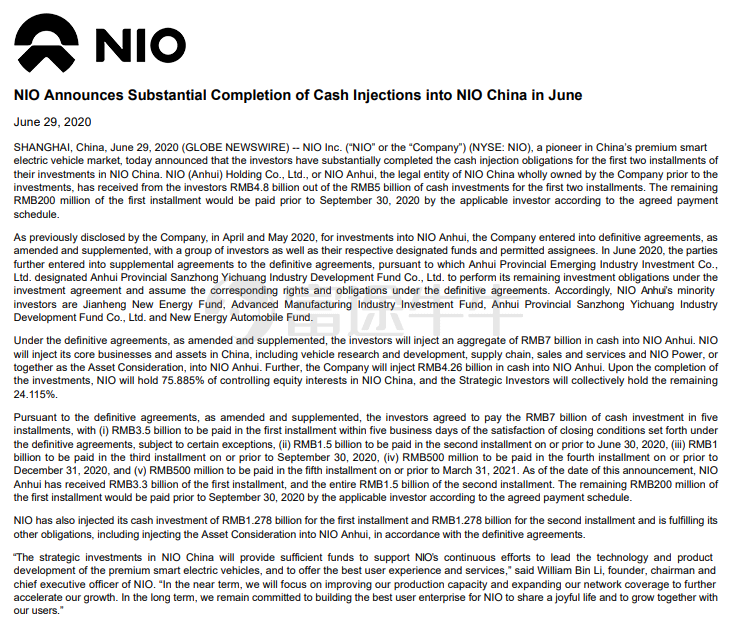 公告显示,截至6月29日,蔚来中国已收到战略投资者第一期33亿元的资金和第二期15亿元的资金投入。同时,蔚来第一期注入资金12.78亿元,第二期注入资金12.78亿元。剩余的资金投入,双方将按照规划有序进行,最晚2021年3月31日完成所有资金注入。