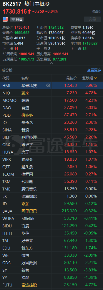 其他中概股方面,跌幅较大的有:第九城市跌9.35%,优信跌8.97%,海亮教育跌7.55%,360金融跌4.00%,新氧跌3.83%,趣店跌3.45%,云米科技跌3.37%,流利说跌1.60%,红黄蓝跌1.08%,迅雷跌1.04%。