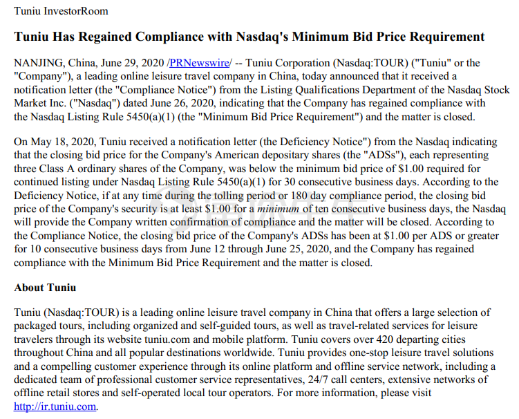 $途牛(TOUR.US)$旅行网发布公告称,6月26日,途牛收到纳斯达克通知函,公司股票收盘价已连续至少10个交易日达到或高于1美元,已重新符合纳斯达克上市规则,此前事项已完结。