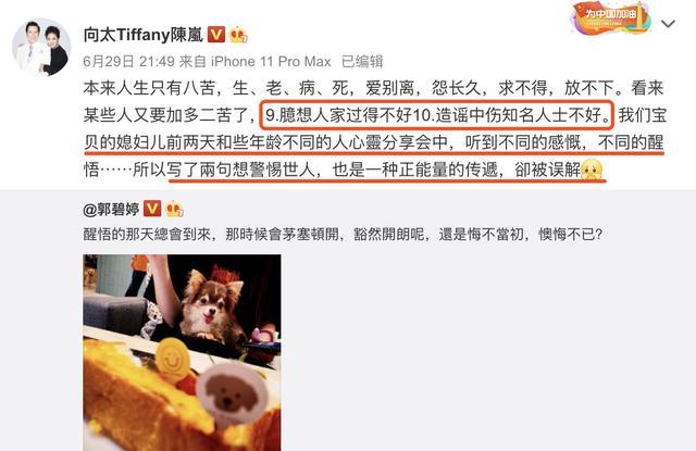 作为儿子和儿媳妇的粉头向太或许也是一头雾水,6月29日晚,才搞清楚了事情,并且解释称宝贝儿媳妇前两天和一些年龄不同的心灵分享会中,听到不同的感慨,不同的醒悟,所以写了两句想警惕世人,也是一种正能量的传递,却被误解。