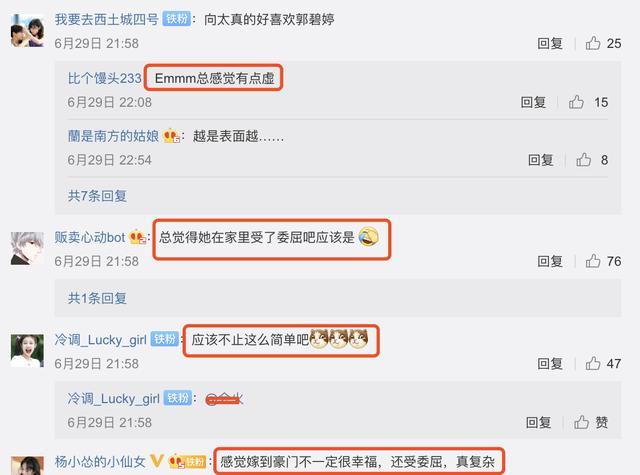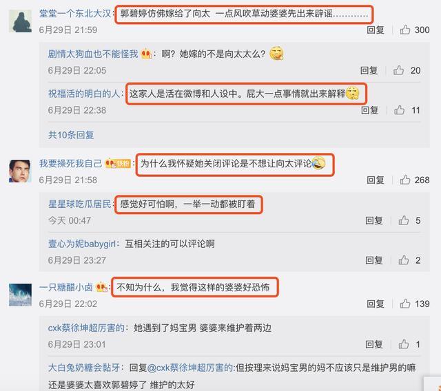 但是在其他人的微博下,我们能却看到网友的评论基本上都是下面这样的,他们觉得郭碧婷仿佛嫁给了向太,芝麻大点事就出来解释,感觉这样的婆婆好恐怖。