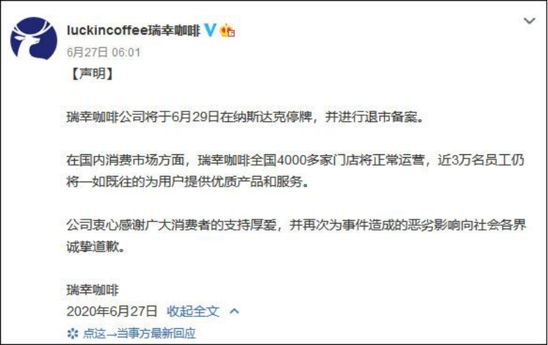6月26日美股开盘前,瑞幸咖啡发布公告称,将撤销之前的听证会申请,并且不再试图推翻纳斯达克对瑞幸的退市决定。目前其已收到纳斯达克法律总顾问办公室通知,股票将在6月29日开盘时停牌,纳斯达克将在所有上诉期限届满后提交退市通知。