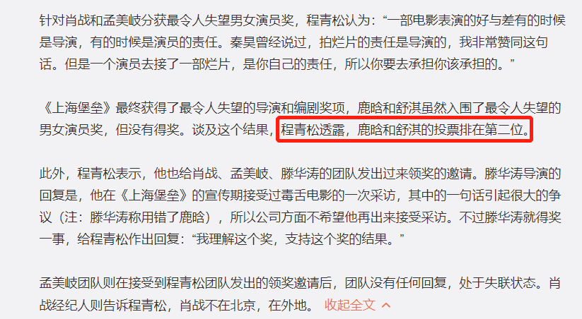 随后,他接受采访的内容曝光。他透露去年鹿晗和舒淇主演的电影《上海堡垒》也入围了最令人失望的男女演员奖,并且投票排在第二位。也就是说,没有《诛仙Ⅰ》中的肖战和孟美岐,这次“金扫帚最令人失望演员”就是他们二位了,肖战在无形中,替鹿晗挡了“枪”?