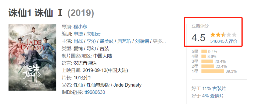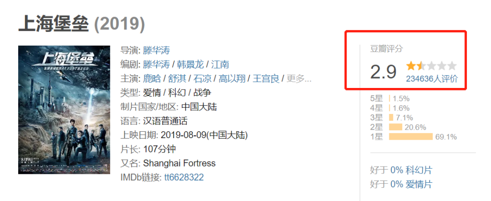 翻看豆瓣评分可以发现,《诛仙Ⅰ》虽然评分也不高,只有4.5分,但是却有9.4%的人给出了5星评价,1星评价只有39.3%,也不算太差。对比《上海堡垒》,评分只有2.9,只有1.5%的观看者给出了5星,1星占比高达69.1%。可见,《诛仙Ⅰ》口碑比《上海堡垒》要好一点。