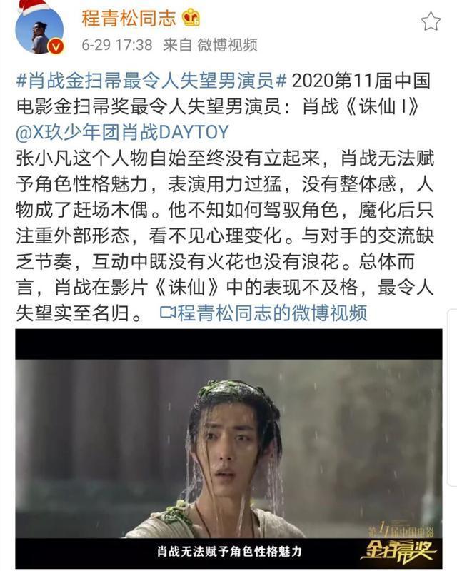 “张小凡这个人物自始至终没有立起来,肖战无法赋予角色性格魅力,表演用力过猛,没有整体感,人物成了赶场木偶。他不知如何驾驭角色,魔化后只注重外部形态,看不见心理变化。与对手的交流缺乏节奏,互动中既没有火花也没有浪花。总体而言,肖战在影片《诛仙》中的表现不及格,最令人失望实至名归。”