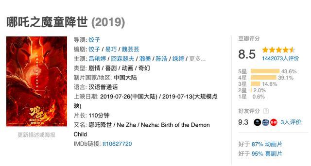 而《哪吒之魔童降世》是中国动画的新标杆,50亿的票房成绩,8.5分的评分。