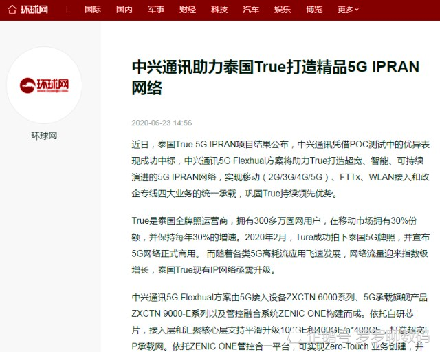 如今中兴的市值也突破1000亿港元的规模,也算真正的通讯巨头了。6月23日,中兴5G再下一城,拿下邻国的5G大单,这个国家就是泰国。来自环球网的报道,泰国True 5G IPRAN项目的招标结果正式公布了,中兴成功中标,凭借的是在POC测试中的优异表现。而且前不久的中兴股东大会上,中兴正式宣布7nm通讯芯片实现量产,5nm芯片也进入技术导入阶段,因此在通讯领域,有华为和中兴的双保险,我们的5G优势将更加明显。