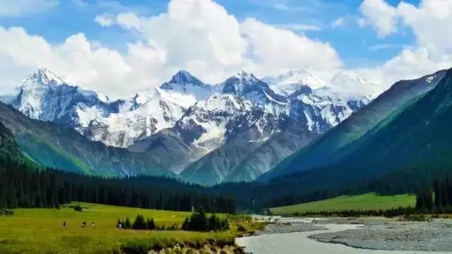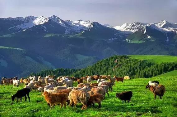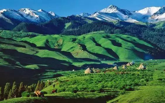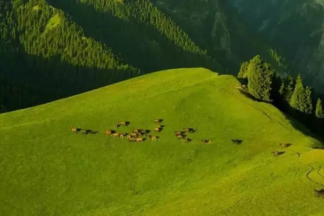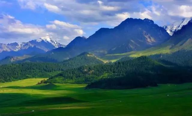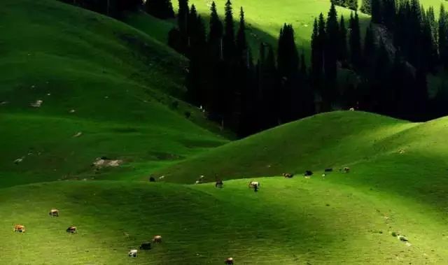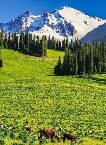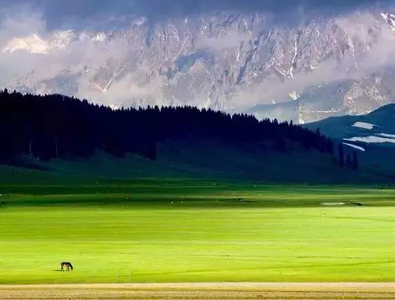 伊犁很美,美在夏天的风吹过唐布拉草原时,铺天盖地的绿波将苍茫大地覆盖,将密集的杉林也浸染了墨绿,唯独远处的雪山依旧闪着寒光。