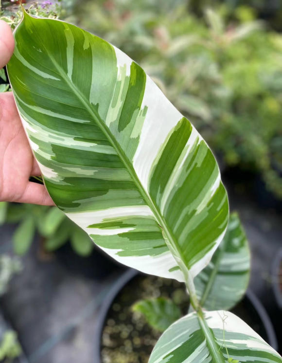 这个是竹芋里的一个品种,名字叫香蕉锦,我们平时见过的竹芋大都是青苹果竹芋、孔雀竹芋、七彩竹芋等,但是这款出锦的油画竹芋,却不多见,很多人以为是假的,摸起来也像假的,手感硬实像塑料布,但是人家真真切切就长这样,非常漂亮,价格也贵,几片叶子就要100多!