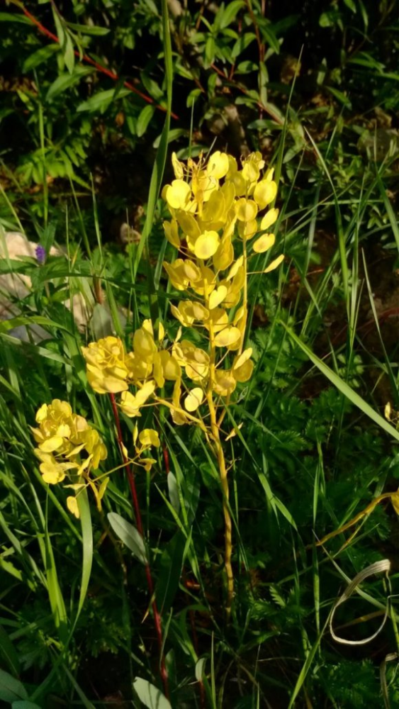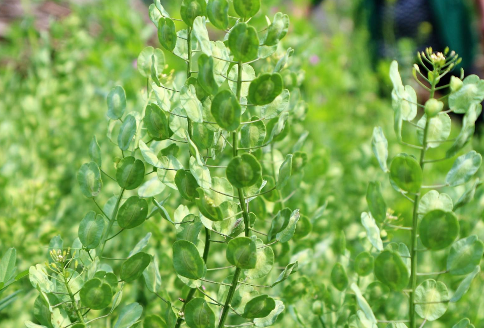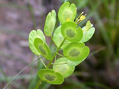 菥蓂是罂粟目十字花科植物,别名多多,它的叶子很特别,是倒卵形的,也像是心形的,叶片中间会结小果实,到秋天以后全株变黄,剪几枝插花很好看。春天菥蓂会开白色小花,花朵没什么特别多,不如叶子好玩。