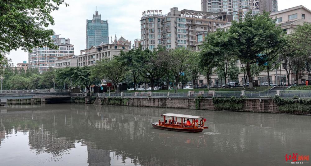 6月28日下午,行驶在锦江上的摇橹船,划开水面,载着三五游客缓缓前行。
