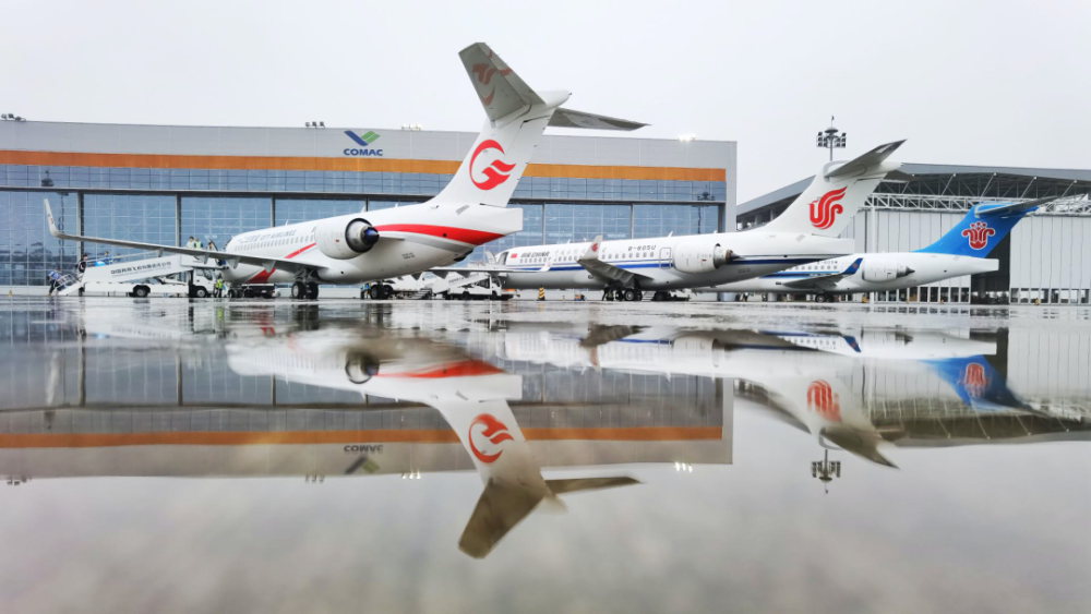 一二三航空、国航、南航ARJ21停在商飞浦东基地机库前(图源:徐炳南)