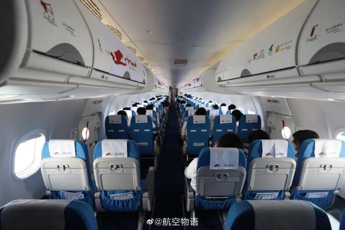 更大的机身截面配合良心的90座布局,座椅前后间距、左右宽度都能称得上“奢侈",都要大于我们常坐的干线客机。如果说数据不直观,某胖语曾经亲测,平时坐经济舱腿会顶到前排座位,在ARJ21上,膝盖距前排还有一拳左右的距离,妥妥的胖胖福音。瘦的人甚至可以轻松地架个二郎腿。