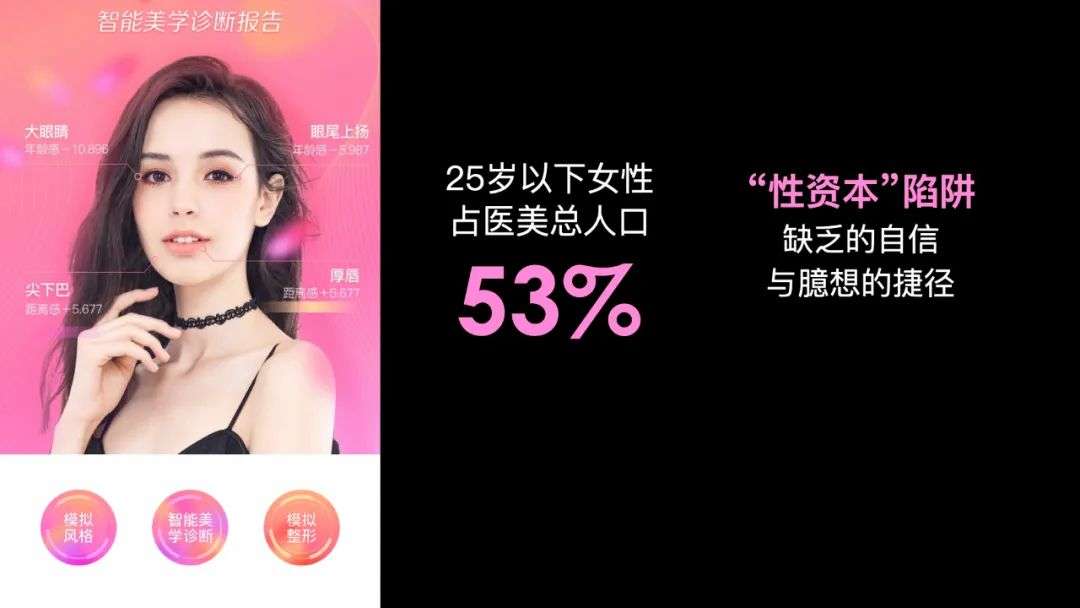 互联网上另外一个热门话题恐怕就是整容了,过去两年医美年轻化的趋势越来越明显,25岁以下的女性占据了医美总人口的53%。其中不乏许多容貌姣好甚至是漂亮的女孩。