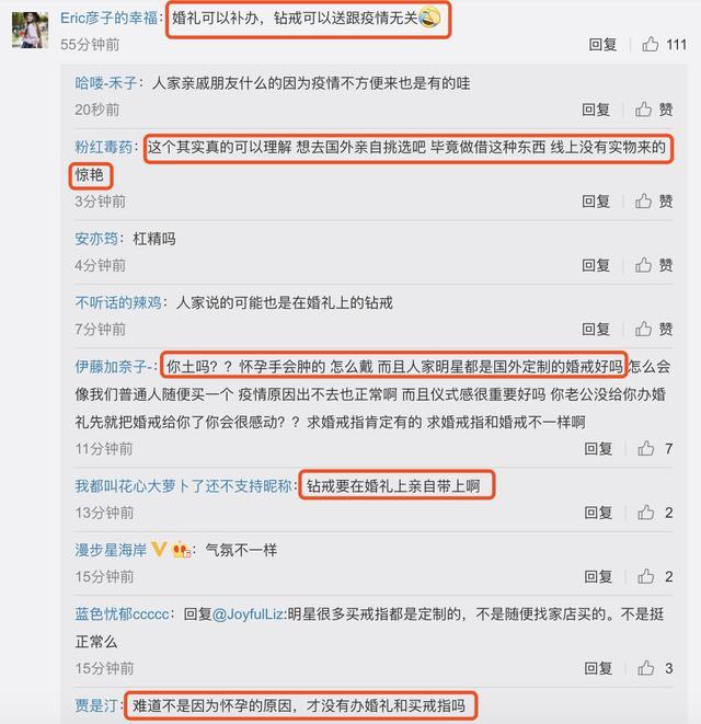 网友们纷纷帮忙解释称,或许郑恺是指结婚钻戒,而不是求婚钻戒,而且明星的钻戒都是要去国外定制的,疫情期间自然不方便,再者,女人怀孕手指都肿了,大小不合适。听起来好像也挺有道理的样子。