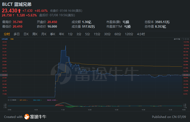 周三,LGBT社区第一股蓝城兄弟今日登陆美股,盘中最高涨幅超100%,收盘大涨46.44%。