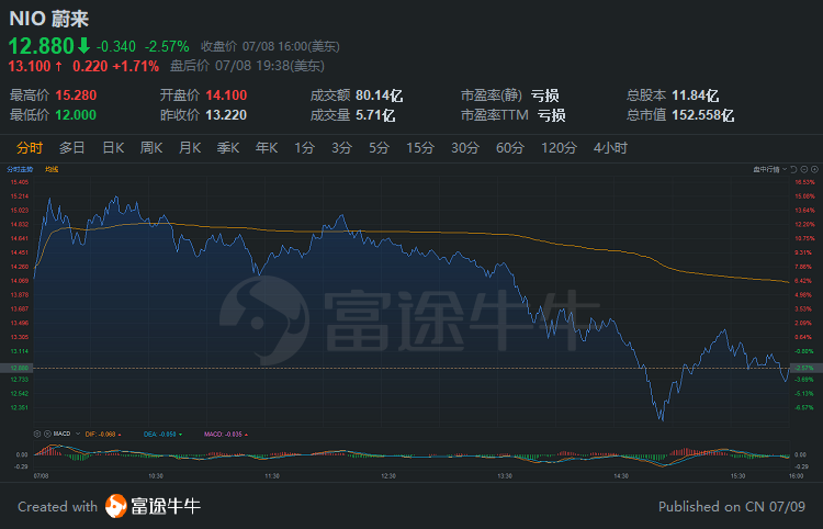 周三开盘,蔚来涨幅一度达15%,盘中股价创历史新高,但随后高开低走,截至收盘收跌2.57%,成交额达80亿美元,较前一交易日放大40%,换手率达到74.721%。