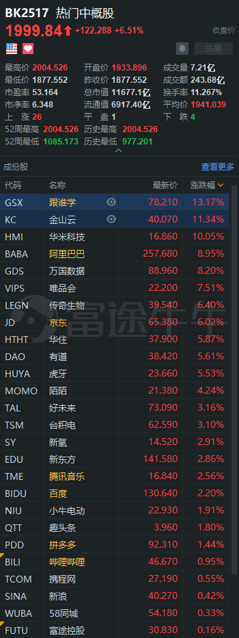 大型中概股中:阿里巴巴涨涨8.95%,京东涨6.02%,网易涨2.31%,百度涨2.20%,拼多多涨1.44%,B站涨0.95%,拼多多涨1.44%,好未来涨3.16%,新东方涨2.86%,跟谁学涨13.17%。