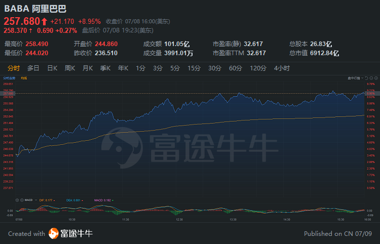 周三,阿里巴巴涨8.95%,续创纪录新高,市值突破6900亿美元,同时创下3年多来最大单日涨幅,此前阿里股价曾于2017年6月8日创下13%的涨幅。