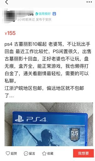 比如这位因为老婆不让玩不得不将自己的PS4游戏降价40%出售的卑微直男: