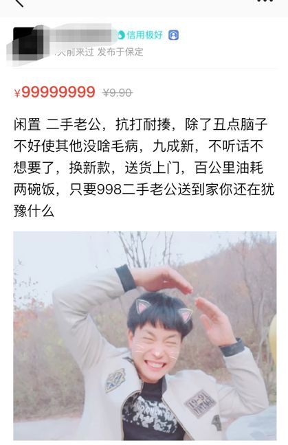 接下来这位女士可能是目前闲鱼上最硬核的卖家了。在其他竞争对手把老公的收藏品一次性挂闲鱼的时候,她出奇制胜,把自己老公一次性挂在了闲鱼上: