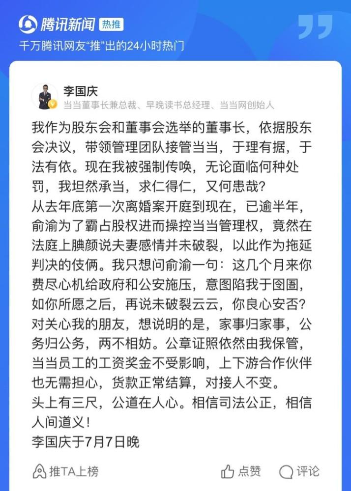 对关心我的朋友,想说明的是,家事归家事,公务归公务,两不相妨。公章证照依然由我保管,当当员工的工资奖金不受影响,上下游合作伙伴也无需担心,货款正常结算,对接人不变。
