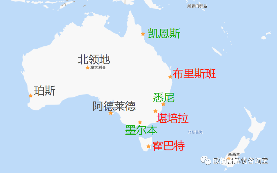 首先列举本文将要介绍的城市:凯恩斯,布里斯班,悉尼,凯恩斯,墨尔本,霍巴特,阿德莱德,北领地,珀斯。
