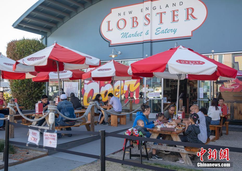 当地时间6月19日,美国加利福尼亚州圣马特奥县居民在一家餐厅就餐。目前,加州重启经济进入第三阶段,只要所在县允许,电影院、餐厅以及大型购物中心等高风险设施可以重新营业。